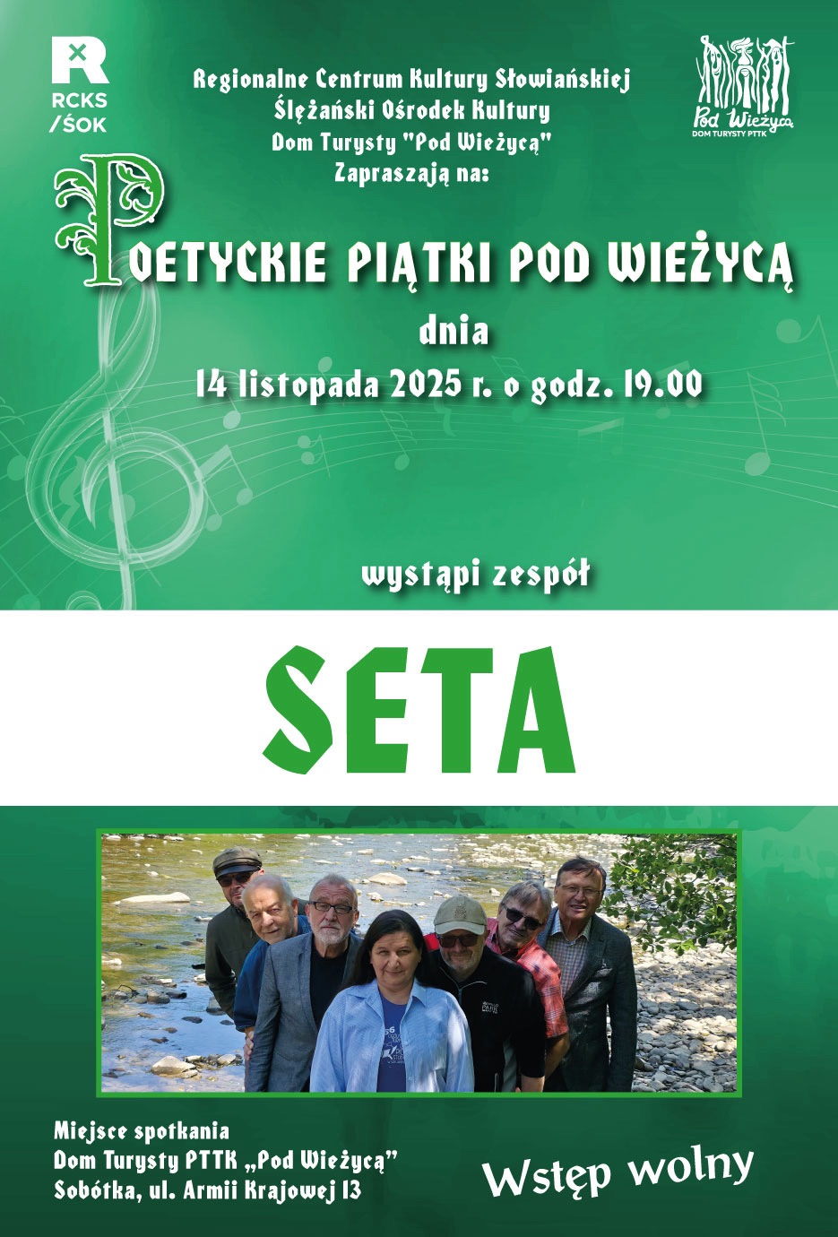 Dom Turysty PTTK „Pod Wieżycą” oraz Ślężański Ośrodek Kultury zapraszają na „Poetycki Piątek” z zespołem SETA. Koncert odbędzie się 14 listopada o godz. 19.00 w schronisku „Pod Wieżycą” (ul. Armii Krajowej 13, Sobótka).