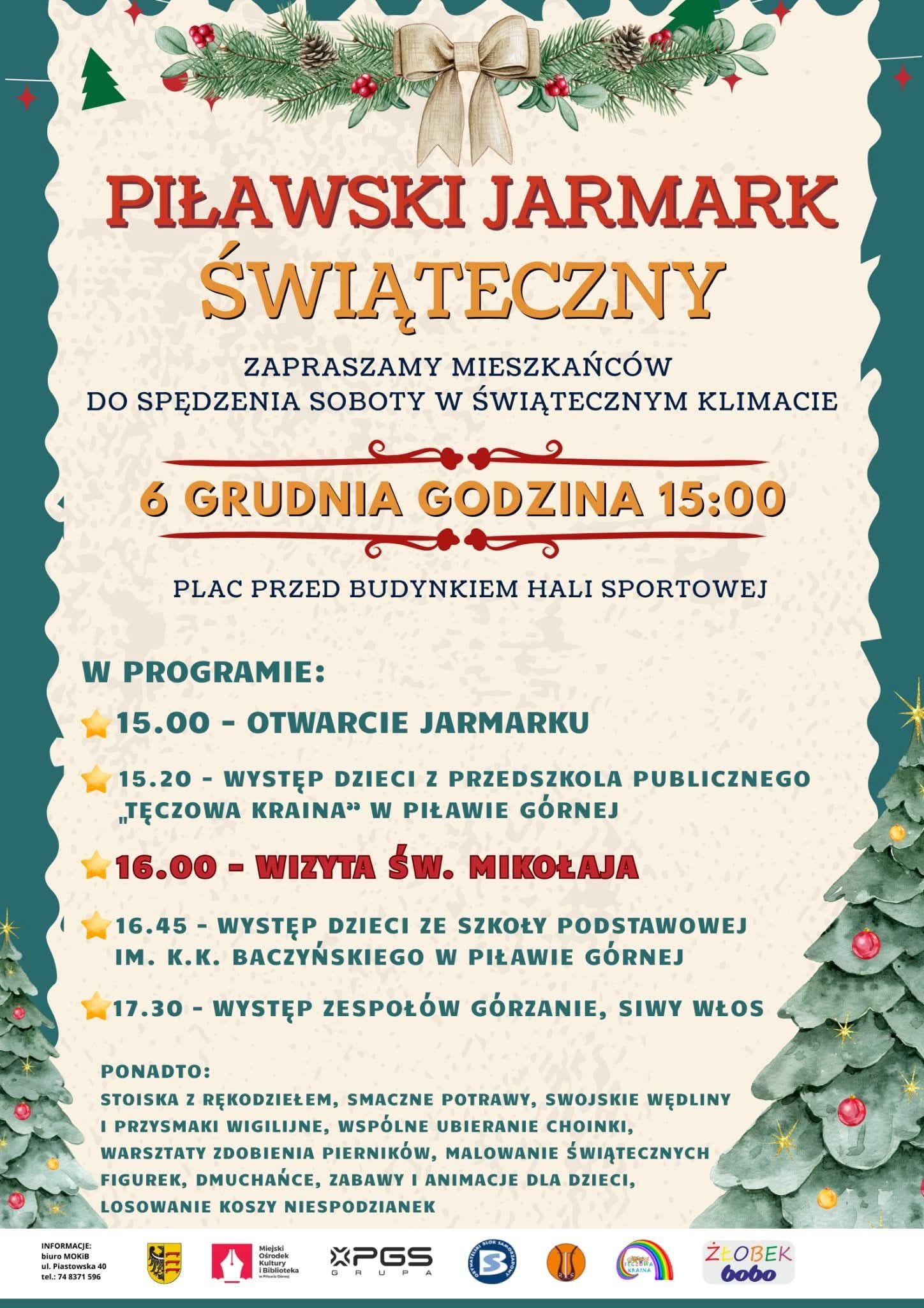 Świąteczny klimat już wkrótce dotrze do Piławy Górnej! Zapraszamy wszystkich mieszkańców i gości na Piławski Jarmark Świąteczny, który rozpocznie się w sobotę 6 grudnia o 15:00 na placu przed halą sportową.
