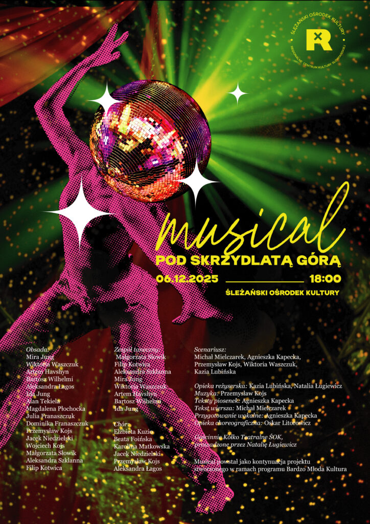 Dnia 6 grudnia 2025 roku o godzinie 18.00, na scenie Ślężańskiego Ośrodka Kultury, będziecie mogli być świadkami wyjątkowego wydarzenia. Kilkunastoosobowa grupa uczestników warsztatów wokalnych, tanecznych i koła teatralnego z naszego Ośrodka Kultury, wystąpi w musicalu.
