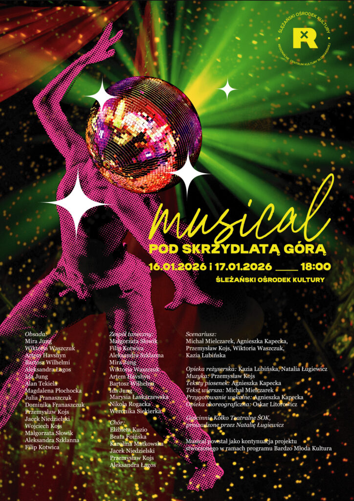 Dnia 16 i 17 stycznia 2026 roku o godzinie 18.00, na scenie Ślężańskiego Ośrodka Kultury, będziecie mogli być świadkami wyjątkowego wydarzenia. Kilkunastoosobowa grupa uczestników warsztatów wokalnych, tanecznych i koła teatralnego z naszego Ośrodka Kultury, wystąpi w musicalu.