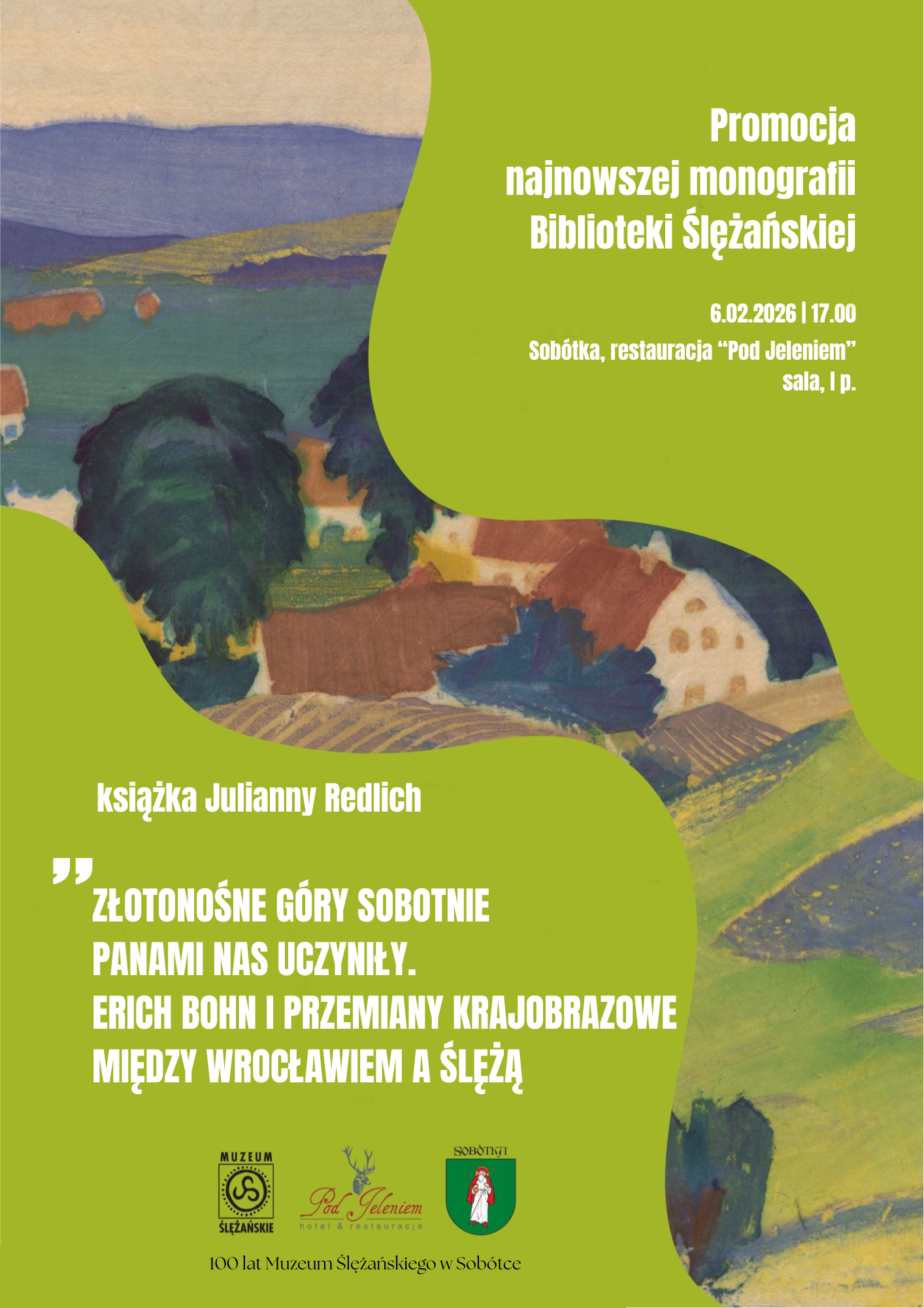 Jubileuszowy rok powstania instytucji muzealnej w Sobótce 1926 rozpoczynamy tematyką długo wyczekiwanej książki. Muzeum Ślężańskie wraz z Uniwersytetem Wrocławskim zapraszają 6 lutego o godzinie 17:00 do Restauracji „Pod Jeleniem” (sala, I piętro) na spotkanie – zapowiedź z dr Julianną Redlich, autorką najnowszej książki wydawanej w ramach serii Biblioteki Ślężańskiej, pt.: ”Złotonośne Góry Sobotnie Panami Nas uczyniły. Erich Bohn i przemiany krajobrazowe między Wrocławiem, a Ślężą”.