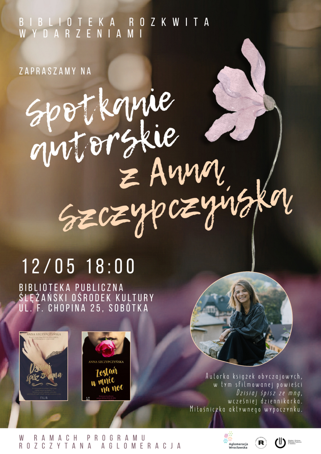 Biblioteka Publiczna w Sobótce zaprasza na spotkanie autorskie z Anną Szczypczyńską, autorką lubianych powieści obyczajowych - w tym sfilmowanej książki "Dzisiaj śpisz ze mną". Przez lata pracowała jako dziennikarka. Miłośniczka aktywnego wypoczynku, która zaraża innych sportową pasją.